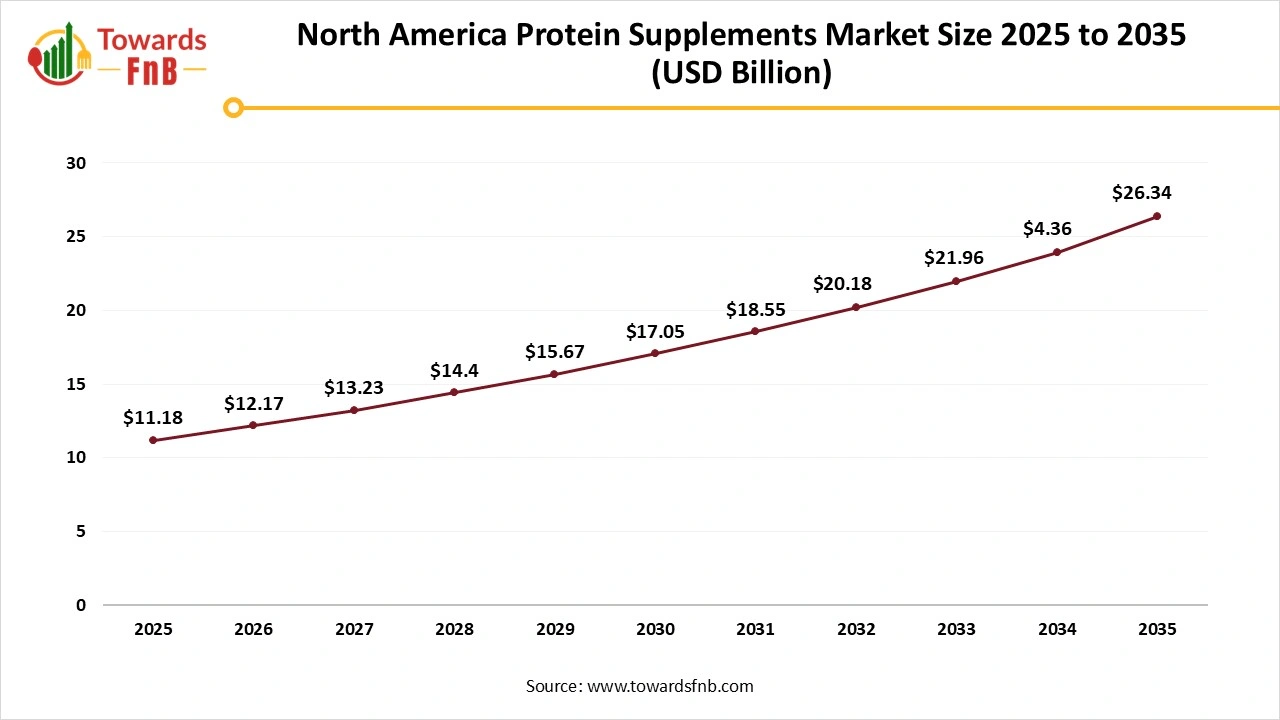 North America dominated the protein supplements market in 2025, due to the growing population of health-conscious consumers following the health and wellness trends, fueling the growth of the market. The market also observes growth due to growing consumer awareness regarding protein for the body, along with other essential nutrients. Hence, it leads to higher demand for protein bar, snacks, and powders, further propelling the market’s growth. The US has made a major contribution to the growth of the market due to higher adoption of active lifestyles and a high following of healthier habits, further fueling the growth of the market.